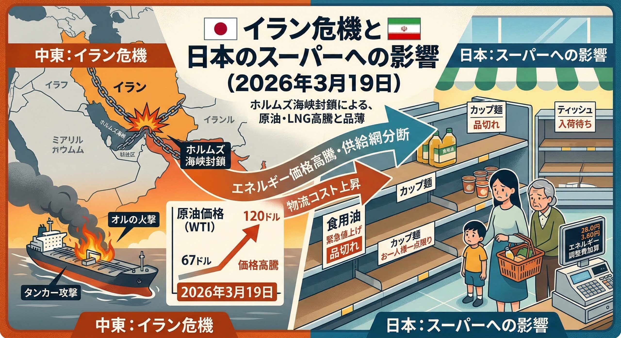 ※ 品不足やパニック買いの予測は、過去の危機(1973年オイルショック・東日本大震災・コロナ禍)のパターンと、今回の構造的要因に基づく分析です。実際の発生を保証するものではありません。